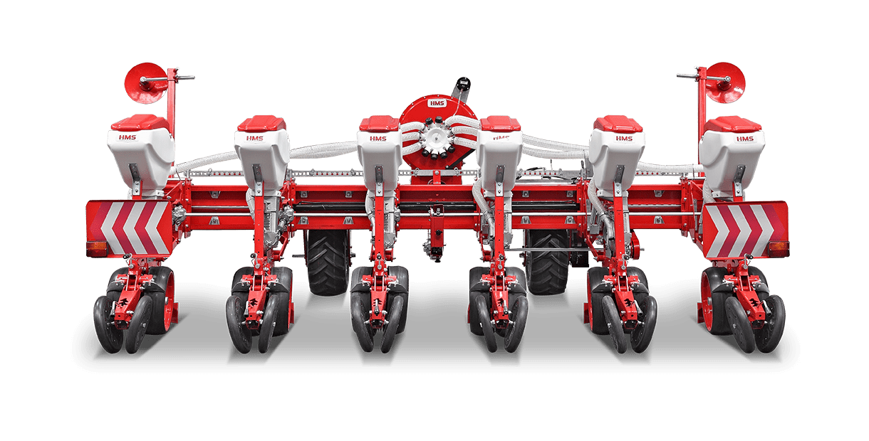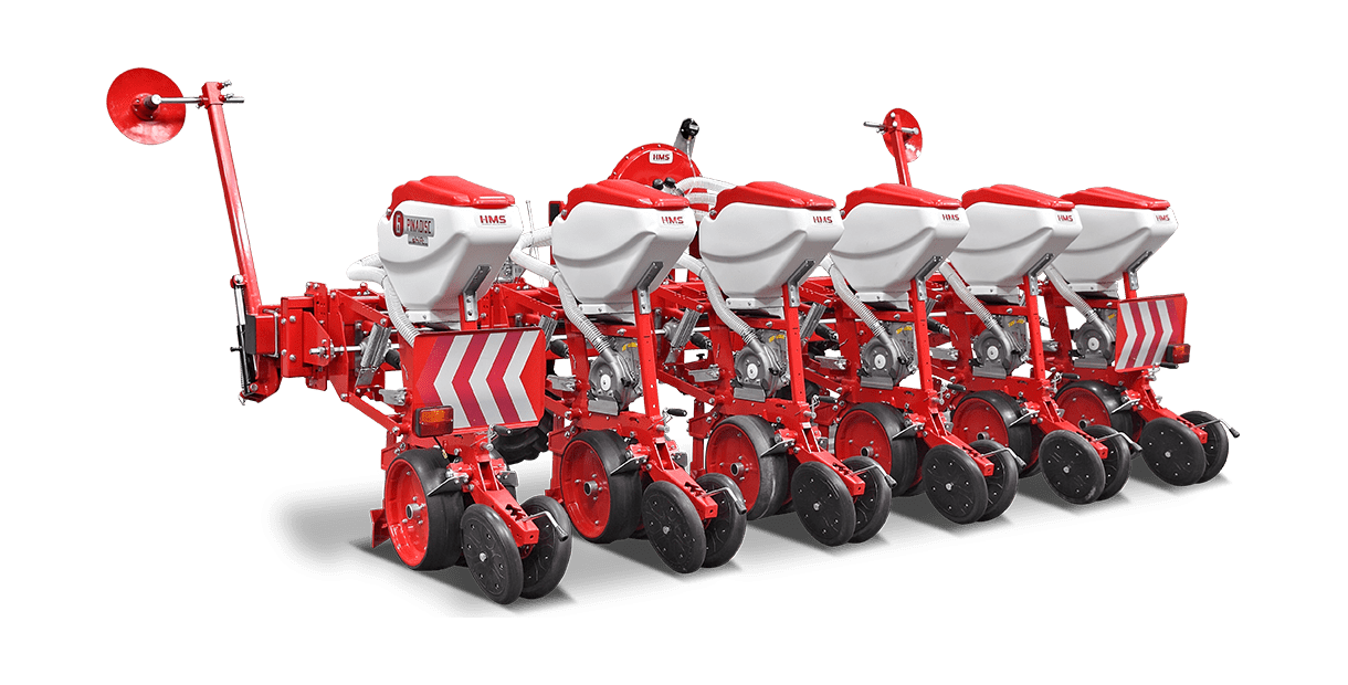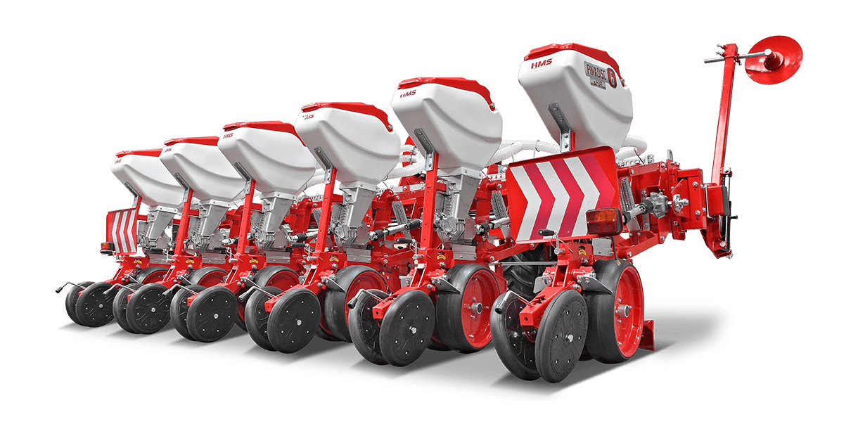 HMS DİSKLİ PNÖMATİK HASSAS EKİM MAKİNALARI her çeşit tohumun hassas olarak, istenilen ekim aralığında ve sıra üzeri mesafesinde ekilmesini sağlar. İsteğe bağlı olarak 4-6-8 sıralı olarak imal edilebilir. Ekici ünitelerde tohum yatağı disk vasıtasıyla açılır. Her ekim ünitesinde özel malzemeden üretilmiş, 2-adet disk bulunmaktadır. Ekici ünitelerin diskli tip olması ve şase önüne takılabilen kesici diskler sayesinde işlenmiş veya yarı işlenmiş sap kalıntıları bulunan tarlalarda çalışabilir. Tekerlekten alınan hareketin ekim ünitelerine iletimi şaft mekanizması ile yapıldığından, sıra üstü mesafelerde hassas ekim yapılabilmektedir. Ekici Ünitelerin her iki tarafında bulunan lastik tekerler sayesinde her türlü toprak şartlarında hassas olarak Derinlik ayarı yapılabilir. Tohum ünite arkasında bulunan V baskı tekerlekleri vasıtasıyla sıkıştırılır. Arka baskı tekerinin uyguladığı basınç ve açı yay vasıtası ile ayarlanabilir. V baskı tekerlekleri toprakta kaymak tabakası oluşumunu önler. Diskli ekim üniteleri erken tavda ekim yapmaya imkan sağlar. Disk ayaklı pnömatik ekim makinaları sırta ekim yapılabilmeye uygundur. Sırtları bozmaz. Tohum yatağı dönerek çalışan diskler tarafından açıldığından sertleşmez. Bitki gelişimine uygundur ve traktöre fazla yük getirmez. Üniteler istenildiği zaman kolayca yol ve iş durumuna geçer. İsteğe göre değişik aksesuarlar montaj edilebilir. Yüksek çalışma hızı ve mükemmel performansı ile zamandan tasarruf ve yüksek verim sağlayan bir ekim makinasıdır.